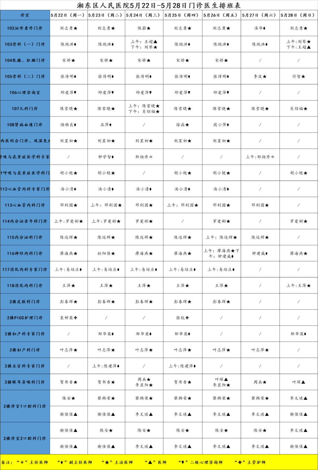 【排班公告】湘东区人民医院5月22日-28日门诊医生排班表