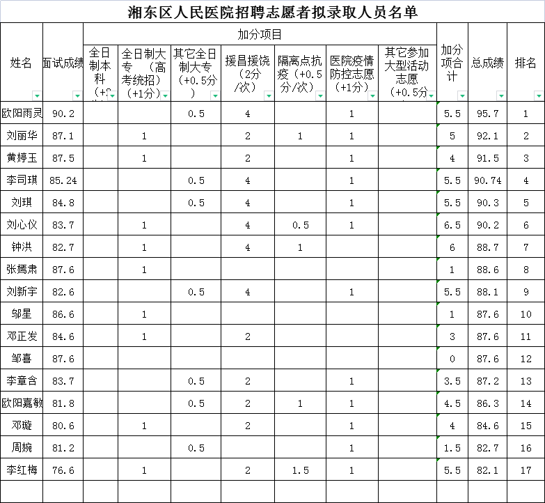 湘东区人民医院招募志愿者拟录用人员公示