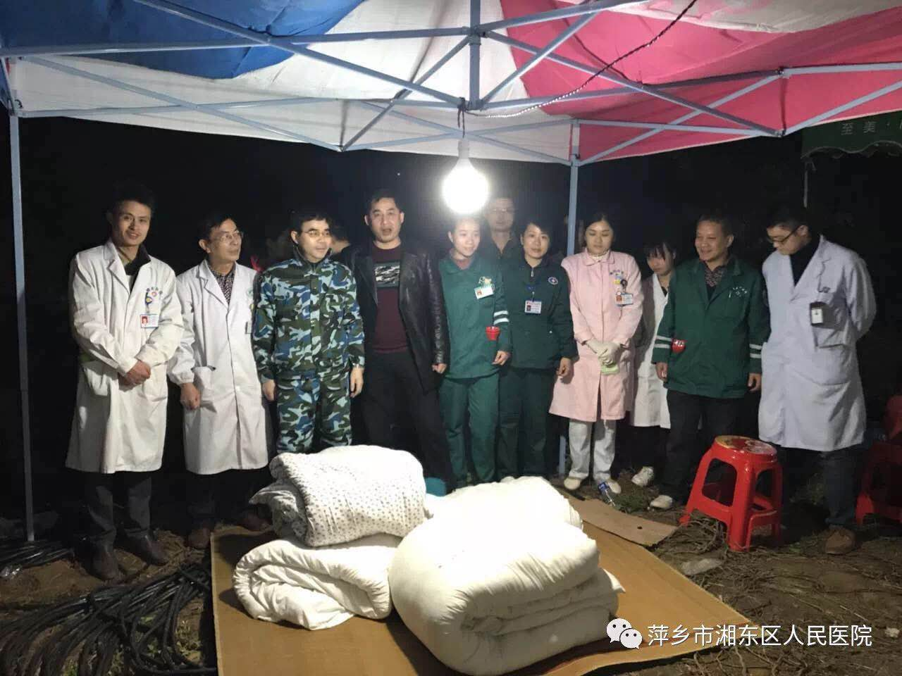 2017年11月26日上午,8名人员先后进入湘东区荷尧镇一未开发溶洞内进行勘察,不慎被困洞中,我院接到指令后,在第一时间派出14人组成医疗救护队,由易培庄院长及医务科陆雅良科长亲自带队参加一线救援。 -