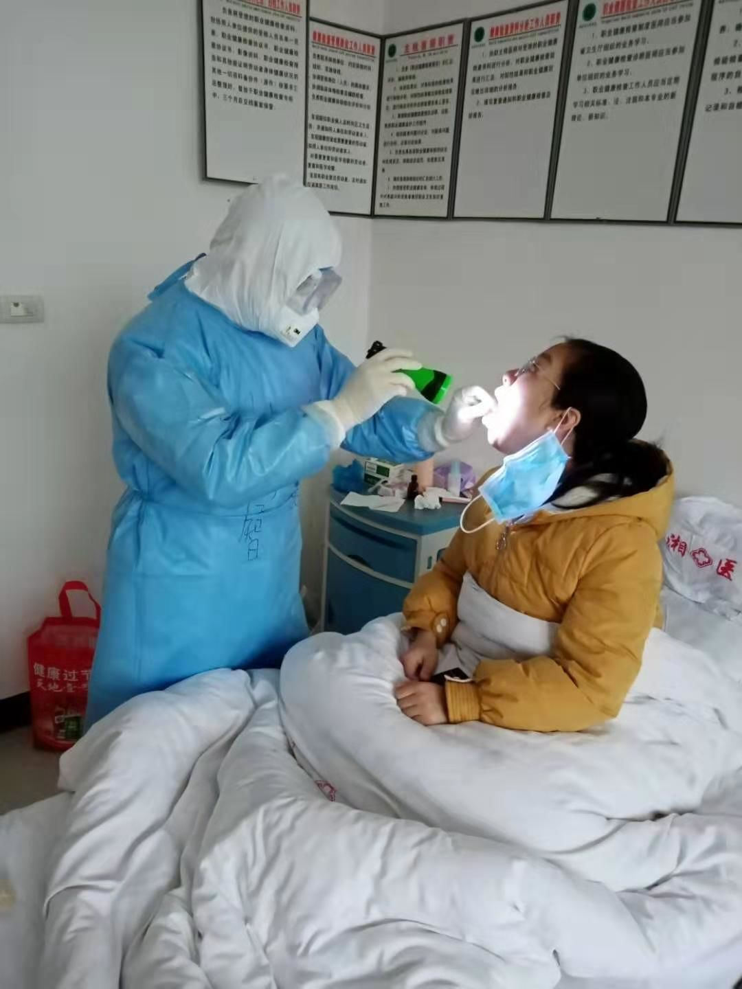 钟学智不是在发热门诊,就是在隔离病房。他每天都会在病房查房,靠近患者,询问患者的病情,给病人检查身体情况,用他的实际行动来鼓励大家勇敢地去面对这些特殊的患者。当患者张嘴的前提下用咽拭子刷取咽后壁分泌物,有较大的飞沫传播感染风险。每次病房来了疑似患者,需要咽拭子标本取样,钟学智都会说:“让我来,我对取咽拭子有经验!”他穿戴好了防护物,很熟练的动作完成采集患者取样。