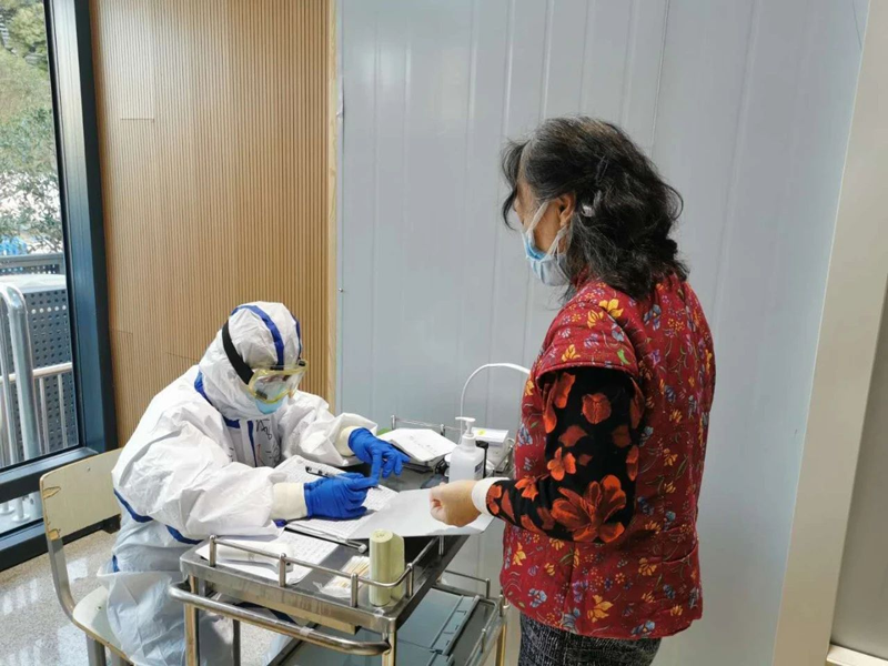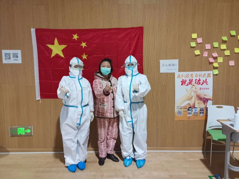 在病房里收获最多的就是感谢和感动,拿一卷抽纸给患者,她说谢谢;发一份饭给患者,她说谢谢……发饭的时候因为带了三层手套,解袋子上面的结很费力,病友们都会过来说我帮你解,你们戴了手套不好弄,我来帮你发。虽然都是很平常的小事情,但是很温暖。每次看到病人出院都感到很高兴,很欣慰。1月23日,核酸检测,突然有人拍我的后背,一看是曹雷,他特意告诉我核酸检测结果和 CT 结果。24日,出来结果还是阴性,157床的曹雷特别激动,因为可以出院,再隔离14天他就可以回家了,当天晚上方舱医院就通知明天出院。当天晚上,我在微信上和他聊了一会儿,我很高兴,好像是自己要出院似的,也算是告别吧!99床邓阿姨可以出院了,当天通知她,阿姨明天你可以出院单间隔离了,阿姨很高兴,一个劲地说:“小姑娘,谢谢你,谢谢你们!我们都出院了就好,你们就可以回家了!”说着还让旁边的病友帮我们拍个照片纪念!