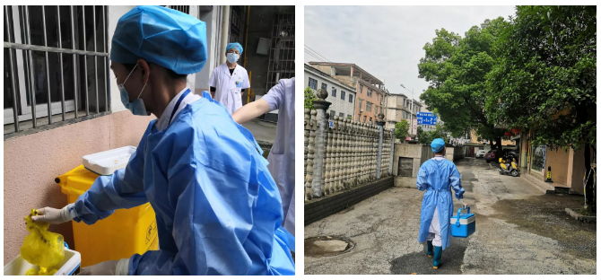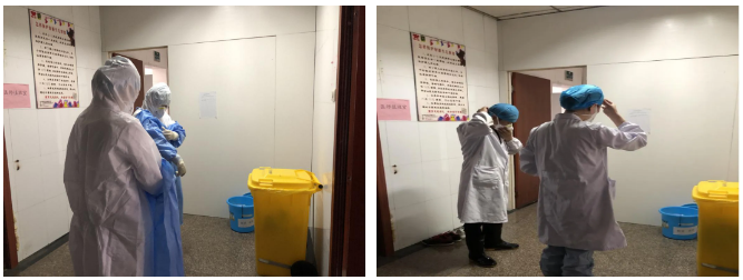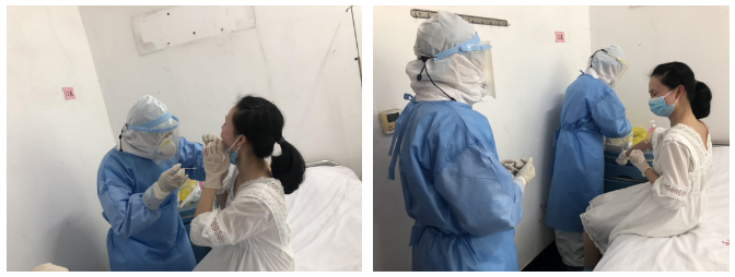 患者和家属到达感染科单间隔离病房,感染科医护人员着三级防护,采集咽拭子、抽血,行核酸及核酸抗体等检测。