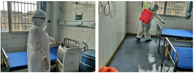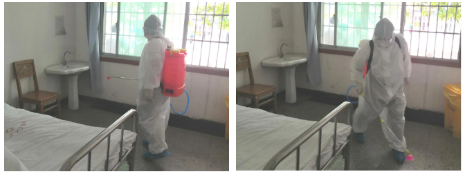 内二科护士着三级防护对病室及被服进行终末消毒处理。保洁员用2000mg/L含氯消毒剂对十六病室进行消杀,30min后再清水擦拭。将感染性织物送洗衣房。