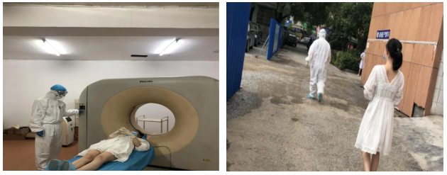 根据会诊意见,医务科通知CT室做好接诊患者准备,同时做好三级防护,患者由经管医师护送,经专用通道到CT室接受检查,检查完毕后,经管医师护送患者至感染科继续治疗。