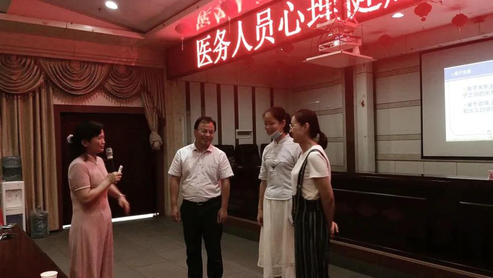 易老师语言风趣、讲解透彻,语气平和,润物无声。通过“冥想”互动、角色扮演、案例分享等方式,围绕亲子教育、自我心理调试、职场心理等几个方面进行讲课,引导医务人员充分认识、合理分辨、正确调解心理压力,舒缓焦虑,对大家进行了一次全面的心灵大扫除。