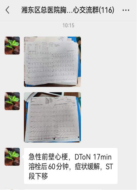 “昨夜我打算睡觉,突然心口一阵疼痛,几分钟后便好些了,可双侧肩膀一直隐隐发疼,我整夜都没有睡好,今早起来感觉肩背更疼了。”当日晨时7:58分,89岁高龄的刘爷爷在家属的陪同下来到荷尧镇卫生院就诊,医生宁玲芬在问诊后考虑冠心病的可能,立即予以心电图检查,初步诊断急性前壁心肌梗死,立即将结果发至湘东区总医院胸痛中心群,联系区医院胸痛中心人员,同时给予吸氧、心电监护、建立静脉通路、胸痛一包药处置,于8:15分予规范的抗凝治疗。